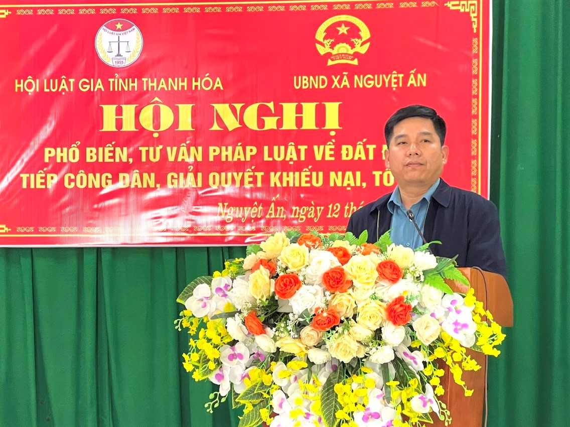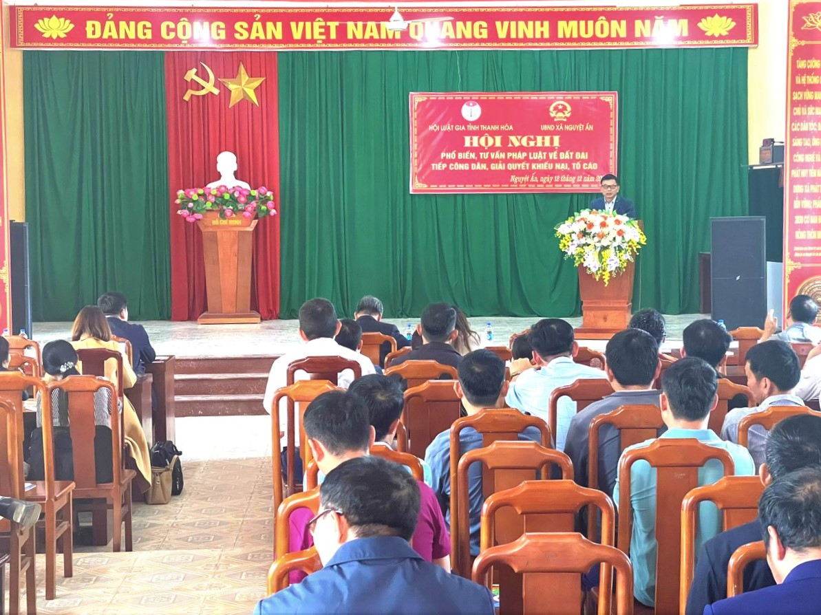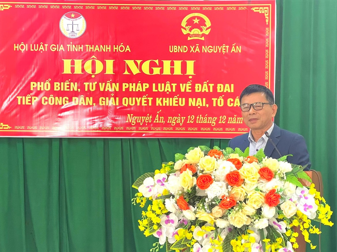 Ngày 12/12/2025, tại Hội trường Đảng ủy xã Nguyệt Ấn, Hội Luật gia tỉnh Thanh Hóa phối hợp Ủy ban nhân dân xã Nguyệt Ấn tổ chức Hội nghị phổ biến, tư vấn pháp luật về đất đai, tiếp công dân, giải quyết khiếu nại, tố cáo cho cán bộ và nhân dân xã Nguyệt Ấn. TS. Nguyễn Thanh Hồng, Phó Chủ tịch Thường trực Hội Luật gia tỉnh Thanh Hóa, dự và trực tiếp truyền đại nội dung Hội nghị.