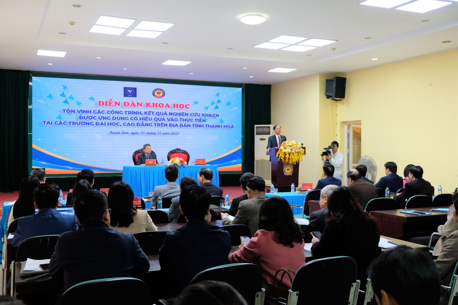 Chiều ngày 25/12/2025, Liên hiệp các Hội Khoa học và Kỹ thuật Thanh Hóa (Liên hiệp hội) và Trường Đại học Hồng Đức phối hợp tổ chức diễn đàn khoa học với chủ đề “Tôn vinh các công trình, kết quả nghiên cứu KH&CN được ứng dụng có hiệu quả vào thực tiễn tại các trường đại học, cao đẳng trên địa bàn tỉnh Thanh Hóa”.